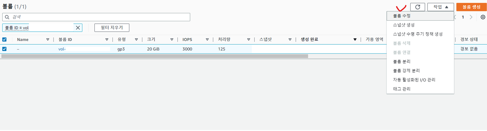 선택된 볼륨을 작업 버튼을 이용해 볼륨 수정 페이지로 이동한다.