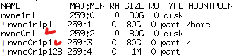 nvme0n1 의 용량이 [자신이 선택한 용량]으로 늘어난 것을 확인할 수 있다. 여기서 nvme0n1는 디스크에 설정된 이름이기 때문에 각자 다를 수 있다. 여기 파티션 p 중 1번은 기존에 사용하던 루트 파티션 용량으로 nvme0n1와 같이 [자신이 선택한 용량] 으로 맞춰주는 작업을 해보자.