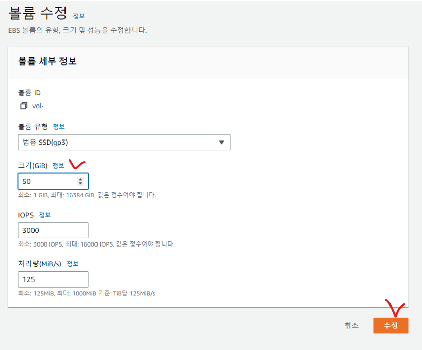 원하는 크기로 변경하고 수정 버튼을 클릭한다. (현재보다 작은 용량으로는 변경이 불가하다.)