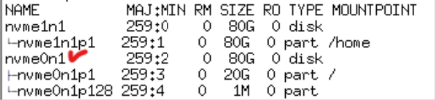 nvme0n1 의 용량이 [자신이 선택한 용량]으로 늘어난 것을 확인할 수 있다. 여기서 nvme0n1는 디스크에 설정된 이름이기 때문에 각자 다를 수 있다. 여기 파티션 p 중 1번은 기존에 사용하던 루트 파티션 용량으로 nvme0n1와 같이 [자신이 선택한 용량] 으로 맞춰주는 작업을 해보자.
