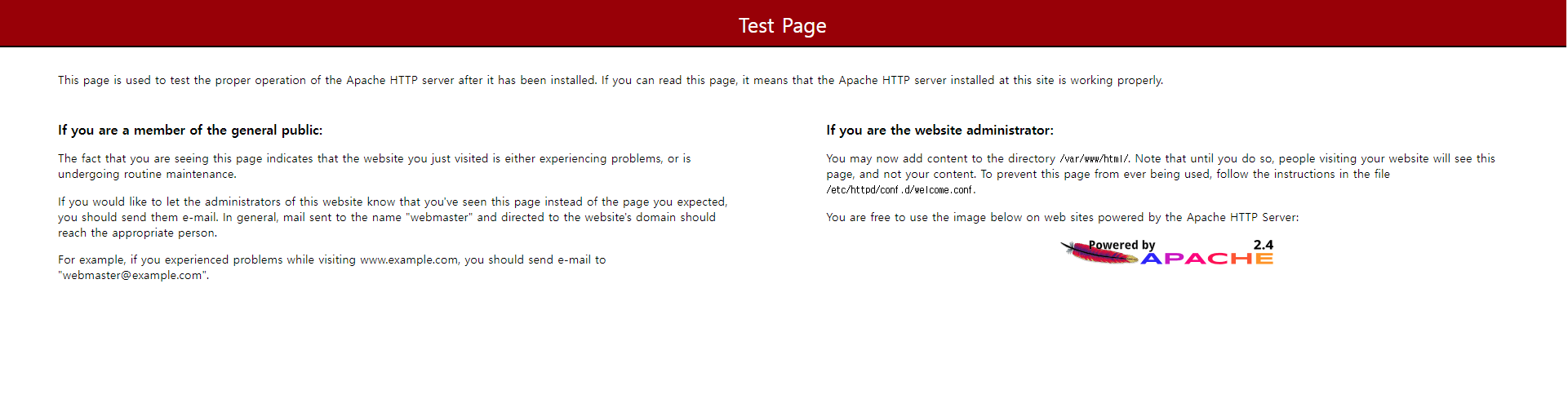 테스트 페이지 정상적으로 웹에 노출되며, 설치는 완료된 것이다.