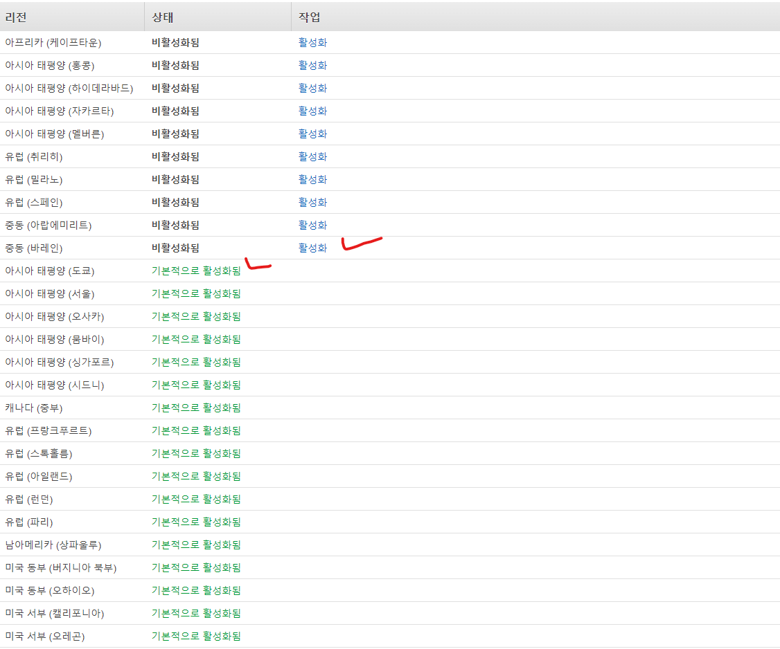 계정에 최초 접속하면 하단부에 AWS 리전이라는 항목이 존재하게 되는데 이중에서 "기본적으로 활성화됨"으로 되어있는 리전들은 비활성화가 불가능하다. 여기서 작업 부분이 활성화 또는 비활성화되어 있는 리전들만 변경이 가능하다.