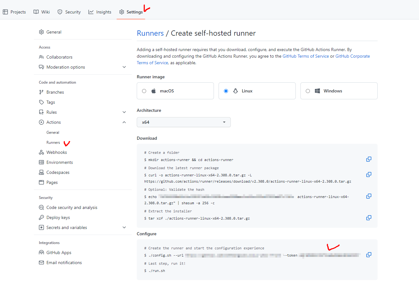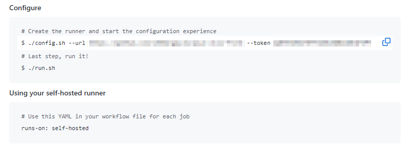 이후 github action 페이지에 있는 configure 명령어를 복사하여 실행합니다.