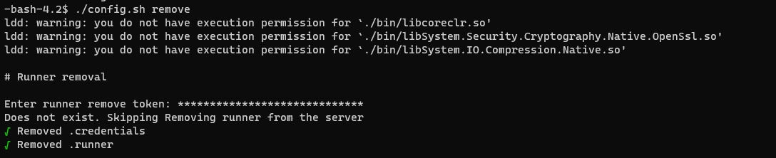 ./config.sh remove 명령어 입력 후 확인해 둔 토큰 정보를 입력해 기존 config 정보를 삭제합니다.