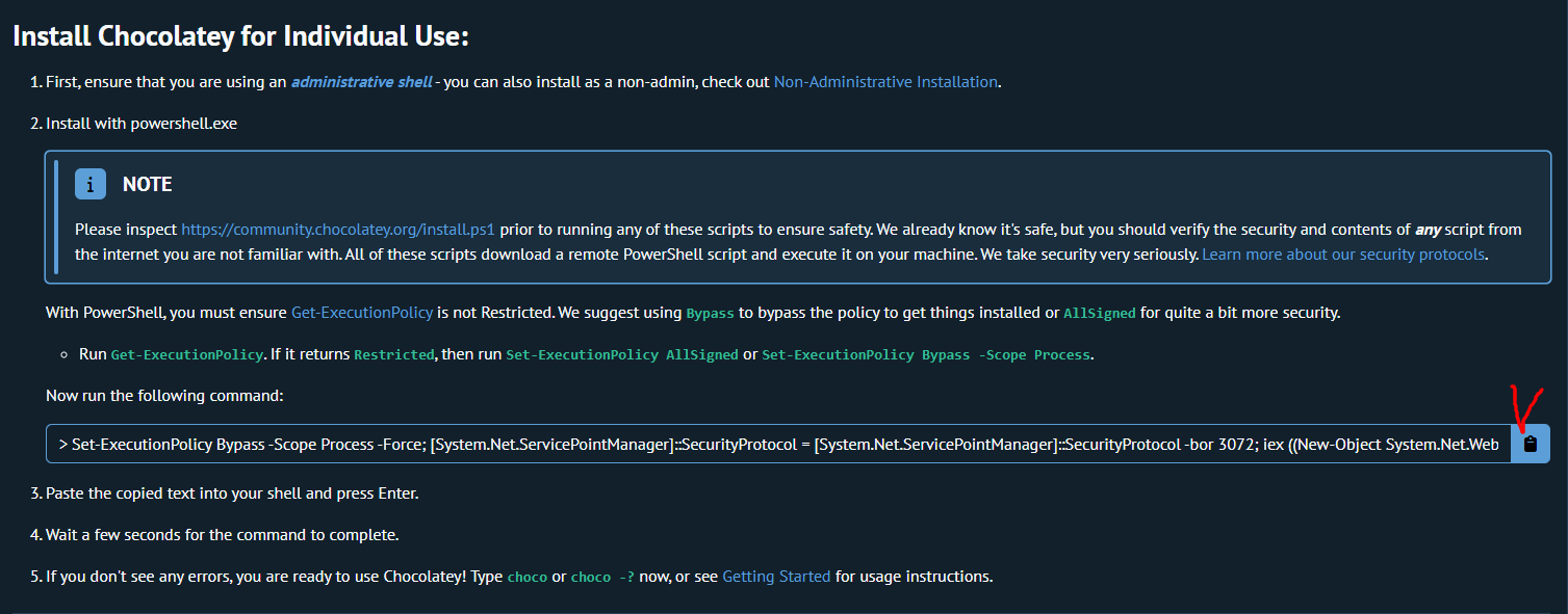 해당 링크에 들어가면 chocolatey를 설치하는 방법을 확인할 수 있다. Now run the following command에 있는 명령어를 복사해서 설치한다.