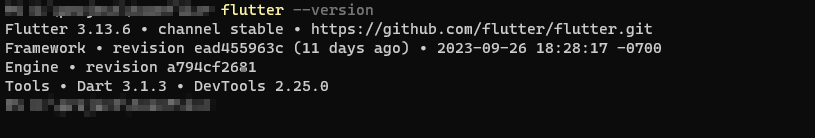 설치가 완료된 후 flutter --version 명령어를 사용하면 현재 버전을 확인할 수 있다.
