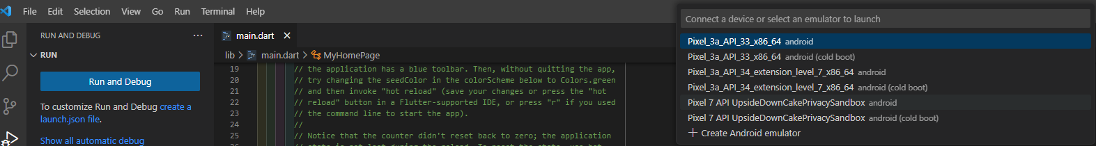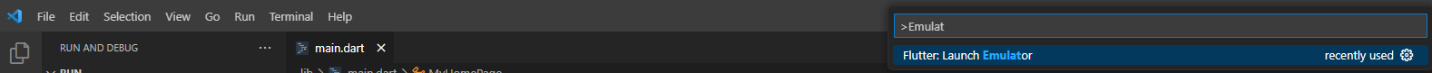 적절한 위치에 flutter create [자신의앱명]으로 만들고 "code ." 명령어로 vscode를 실행한다. ctrl + shift + p 단축기 이후 Emulator를 입력하여, Launch Emulator 통해 자신이 실행할 에뮬레이터를 선택한다.