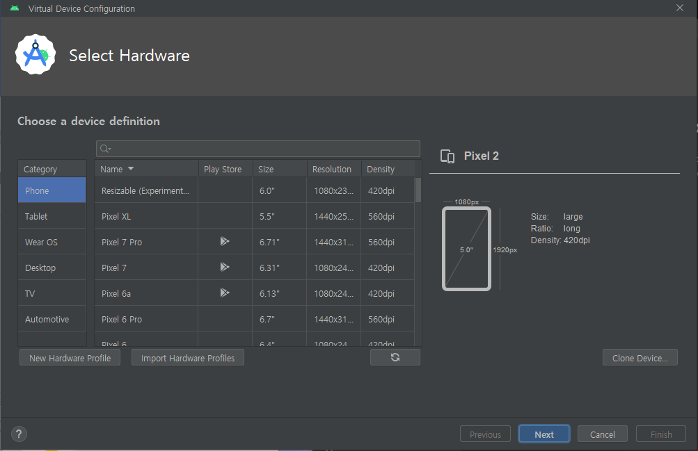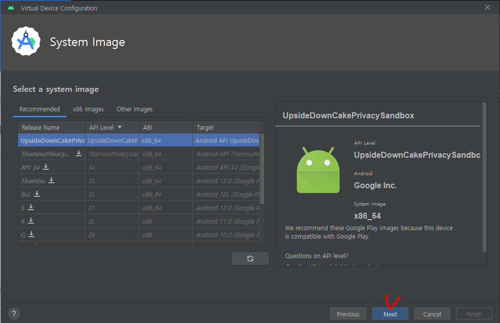 자신이 원하는 기종의 이미지 셋업을 클릭하고 Emulator를 생성한다.