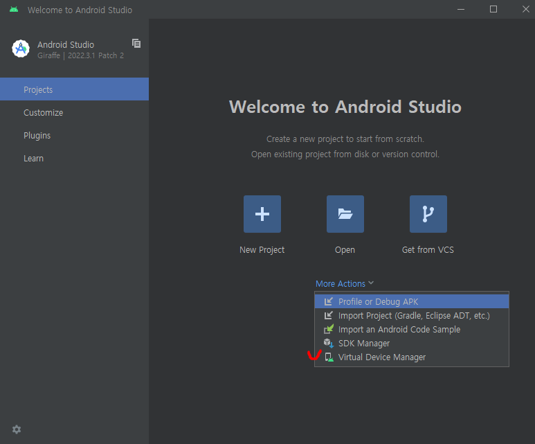 안드로이드 스튜디오 설치가 완료되고, 실행 시 아래와 같은 화면이 나타나게 되는데, 여기서 Virtual Device Manager를 클릭해 준다.