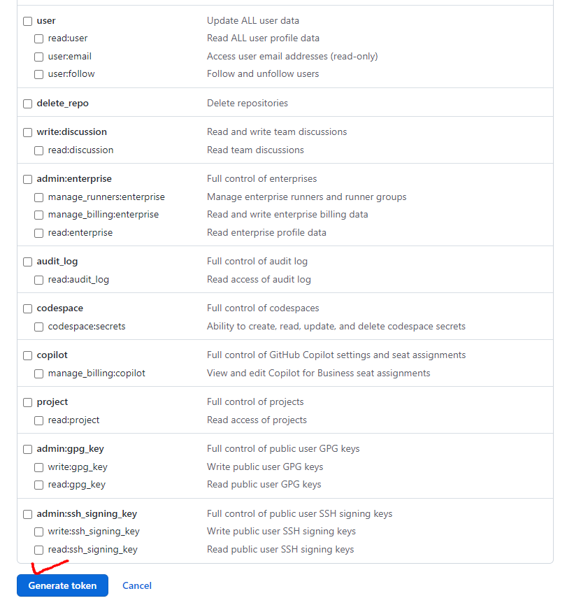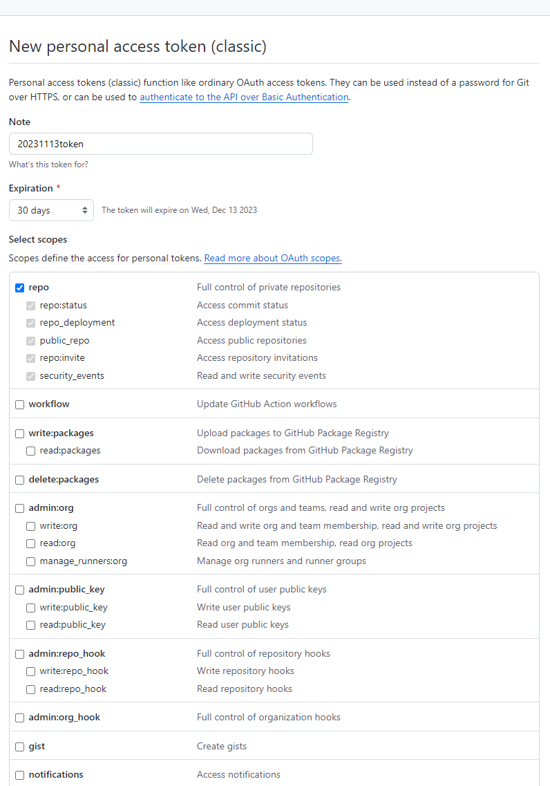 Note 에는 원하는 이름을 작성해준다 Expiration은 해당 토큰의 만료 일자인데, 자신의 원하는 기간으로 설정할 수 있다. 보안상에 문제가 생길 수 있으니 귀찮아도 90일 정도로 설정하는 것을 권장한다. 이후 스코프는 repo 정도만 체크한 후 토큰을 생성하면 된다.