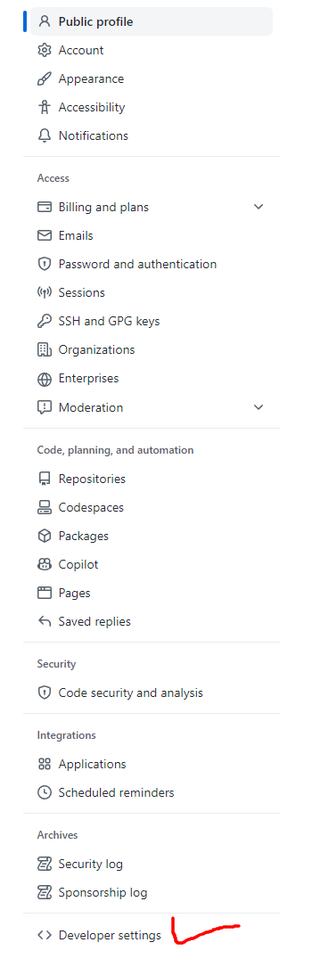 클릭 시 이동 되는 페이지 좌측 내비게이션 바에서 Developer settings를 클릭한다.
