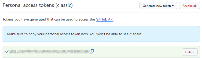처음 생성 시 아래와 같은 토큰이 문자열 형식으로 나오게 되며 해당 문자열을 잘 저장해 두고 깃 저장소와 연결이 필요할 때 사용하면 된다.