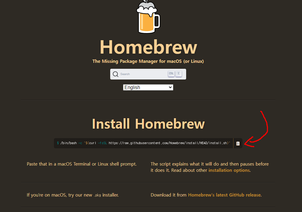 install homebrew 에 위치한 명령어를 복사한후 Terminal 을 실행 시킨뒤 해당 명령어를 실행시킨다.