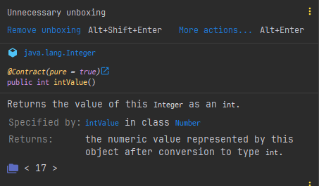 인텔리제이에서 intValue()는 런타임시 자동으로 적용되기 때문에 unboxing 이 따로 필요 없다고도 알려주고 있다.