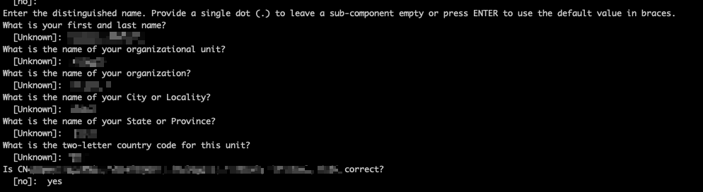 위의 명령어를 사용하면 여러가지 입력하라고 나오는데, 자신의 프로젝트에 맞게 입력하면 된다. 마지막에 corret?에서 yes를 입력하지 않고 그냥 enter를 누르면 처음부터 다시 입력해야 하니 주의하자. 비밀번호는 추후에 SHA 인증서 출력할때 다시 입력해야 하니 잘 기억해 두어야 한다.
