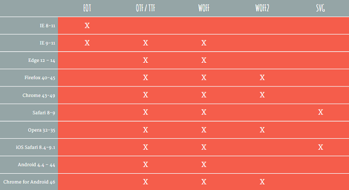WOFF2는 모든 주요 웹 브라우저에서 지원된다. 사실상 모든 웹 사용자에게 최적의 텍스트 표시 경험을 제공할 수 있으며,