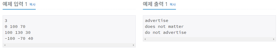 첫째 줄에 테스트 케이스의 개수 N이 주어진다. 다음 N개의 줄에는 3개의 정수 r, e, c가 주어진다. r은 광고를 하지 않았을 때 수익, e는 광고를 했을 때의 수익, c는 광고 비용이다. (-106 ≤ r,e ≤ 106