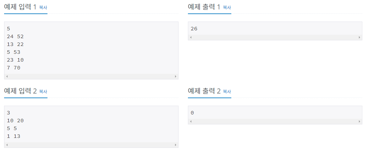 다음 N 개의 줄에 각 학교의 학생 수와 배정된 사과 개수를 나타내는 두 개의 정수가 주어진다.