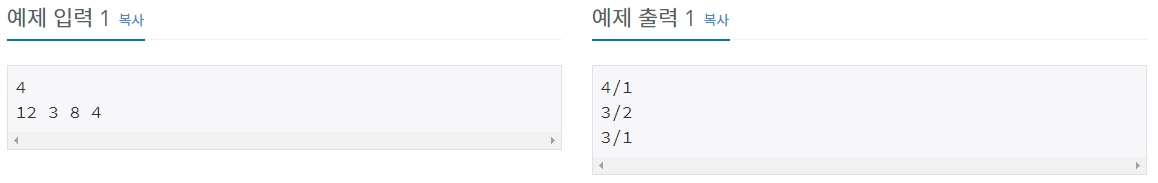 출력은 총 N-1줄을 해야 한다. 첫 번째 링을 제외한 각각의 링에 대해서, 첫 번째 링을 한 바퀴 돌리면 그 링은 몇 바퀴 도는지 기약 분수 형태 A/B로 출력한다.